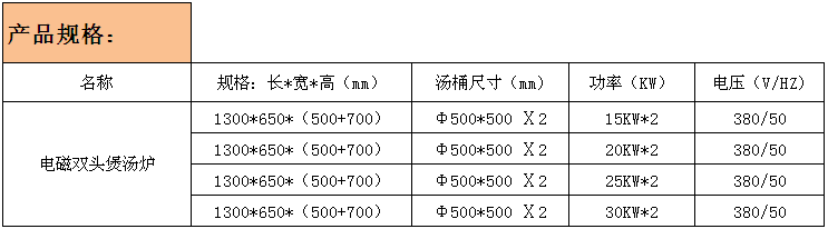 产品名称:电磁双头煲汤炉(设备尺寸可定制),汤桶尺寸有:Φ400、Φ450、Φ500、Φ600