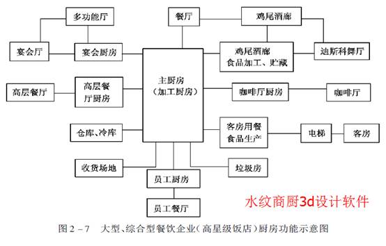 商用厨房的职能随餐饮企业规模的大小和经营风味、风格的不同而有所区别。大型、综合型餐饮企业的厨房规模大、联系广,各部门功能比较专一。图2-7为大型、综合型餐饮企业厨房功能示意图。中、小型餐饮企业厨房的有些功能则合并在一起,结构联系也较为简单。